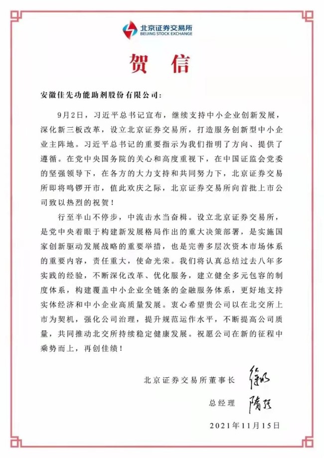 11月15日,华体网页版旗下安徽佳先功能助剂股份有限公司正式成为全国首批北京证券交易所上市企业。北交所就佳...
